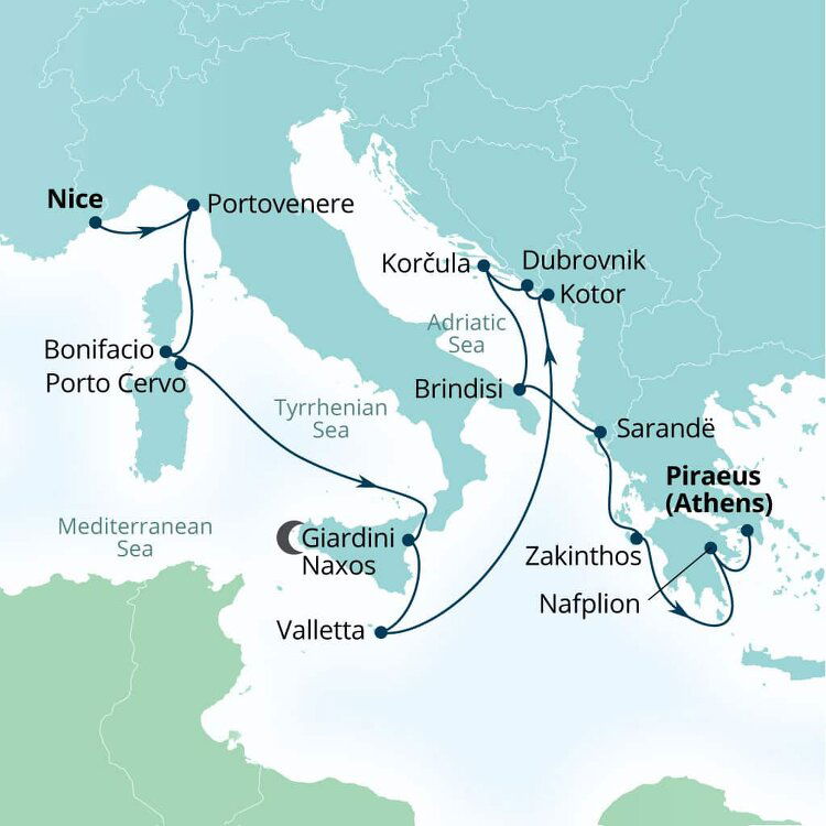 Giardini Naxos is a picturesque port town on the east coast of Sicily, nestled at the foot of Taormina and home to stunning beaches and ancient sites. Tender boats usually transport visitors from ships anchored in the bay directly to the heart of town, with the tender drop-off point a stone's throw away from main attractions. Once ashore, visitors can relish the town's beautiful beaches, archaeological sites, and tantalising Sicilian cuisine. Giardini Naxos also serves as an excellent base for excursions to the iconic Mount Etna, approximately 45 km (about 28 miles) away, or the historic town of Taormina, just a 20-minute drive up the coast.