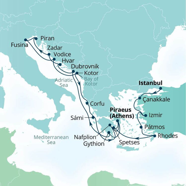Piraeus, the primary port for Athens, is located about 12 kilometers (7.5 miles) southwest of the city center. Cruise ships dock at the Piraeus Cruise Terminal, from where it takes roughly 20-30 minutes to reach Athens by taxi or train. The metro station is within walking distance of the port, offering a convenient and cost-effective way to get to the city.