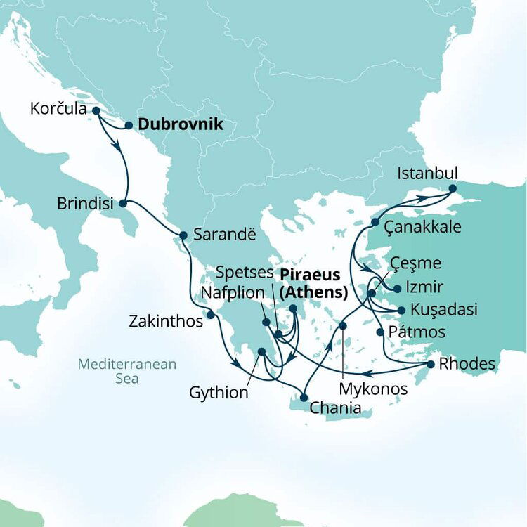 Cruise into Cesme, a charming coastal town on the Aegean Sea. The port is conveniently located near the city's centre, and within walking distance, cruisers will find a range of amenities, including shops, cafes, and local markets.