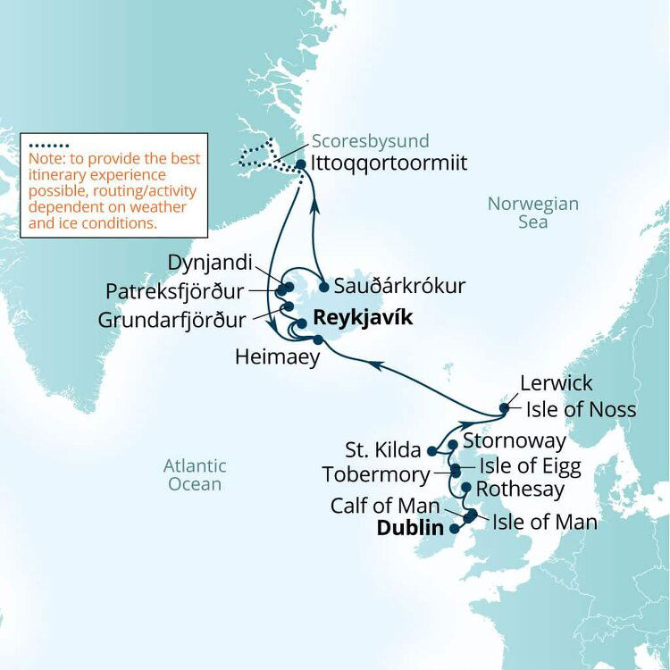 Grundarfjordur is a picturesque town situated on the fjord of Beidafjordur on the Snaefellsnes Peninsula. This charming fishing village is located right next to Kirkjufell mountain, the most photographed mountain in Iceland. Ships will dock at the Port of Grundarfjordur.