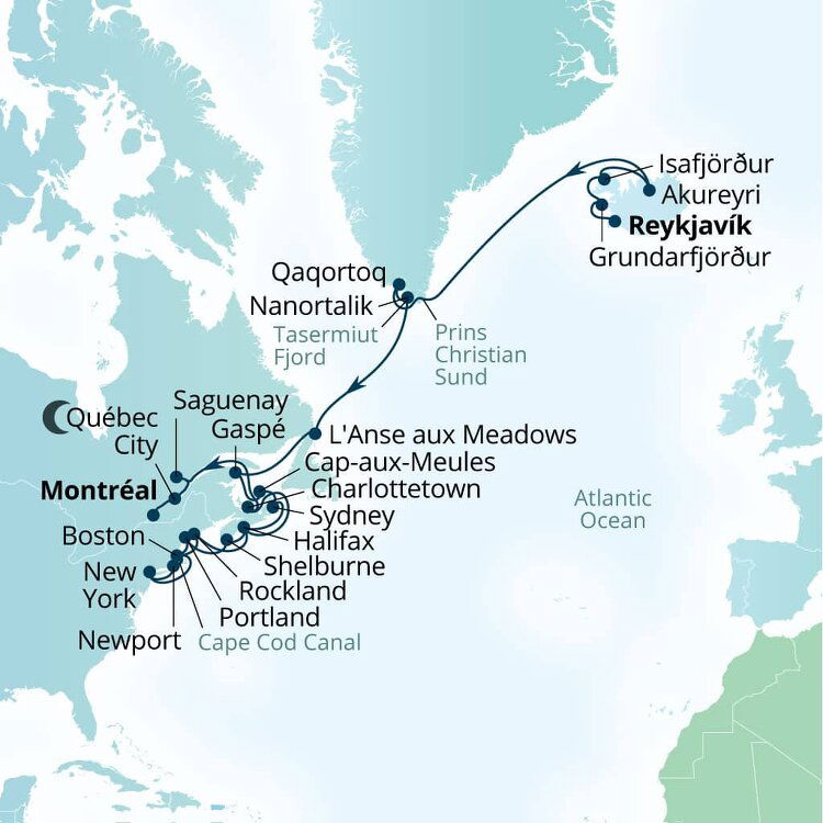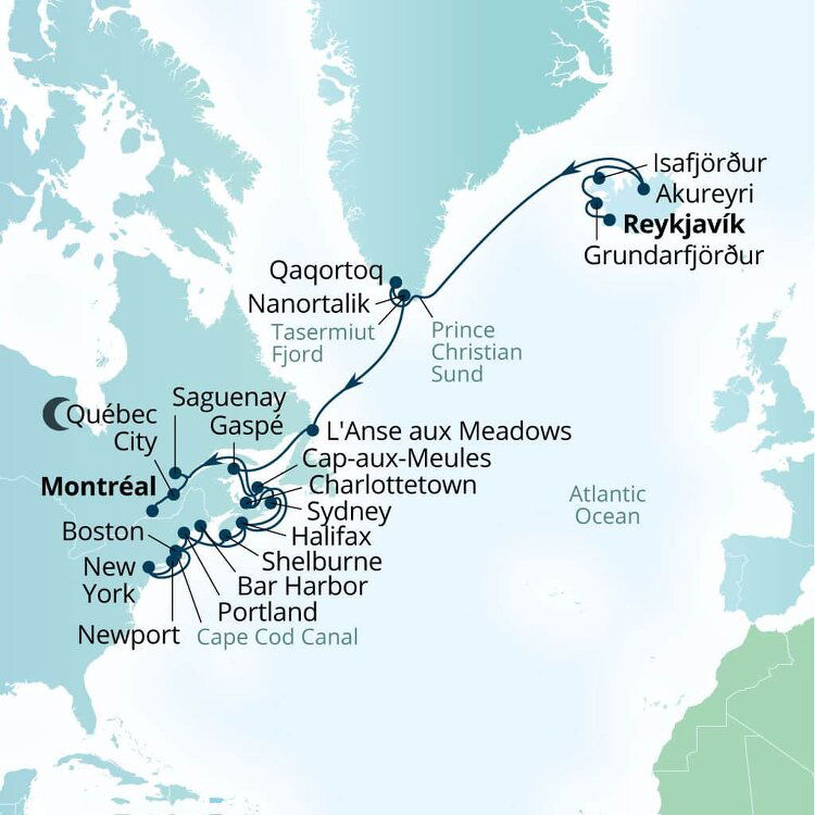 Nanortalik is located on a small island in the southern tip of Greenland. It is an adventurer's wonderland with vertical cliff walls, sheets of floating sea ice and a plethora of Arctic wildlife, including seals and Minke, humpback and fin whales. Sometimes polar bears can also be spotted on the offshore flow of ice. Ships will anchor offshore and tender guests to shore.