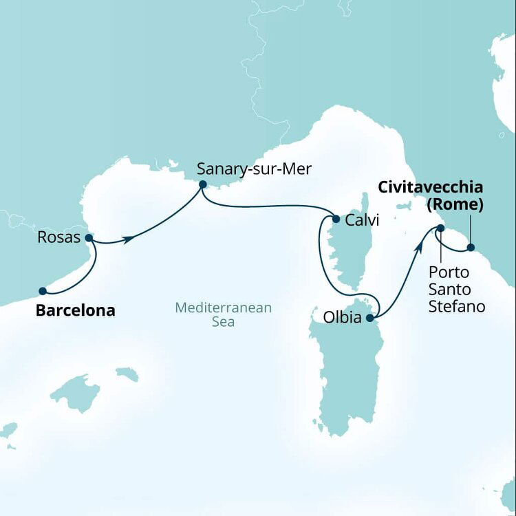 Located on the island of Corsica, Calvi is a beach town with a medieval past. Its cobbled streets climb up to an imposing Genoese Citadel which overlooks a sweeping bay of powdered white sand fringed by maritime pine trees. Ships will anchor offshore and tenders will be proved to Quai Landry.