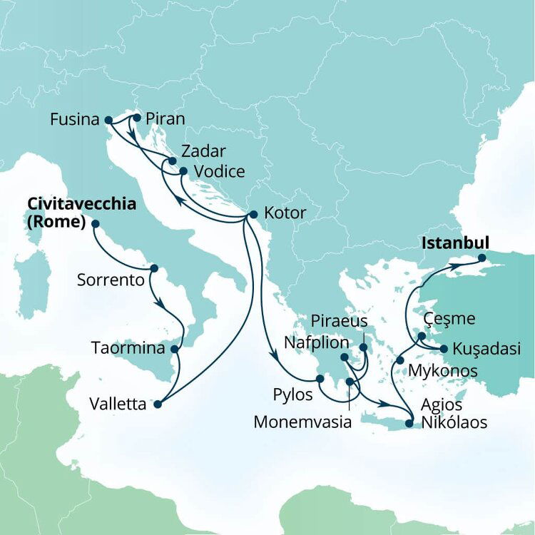 Set on the east of the Greek island Crete, Agios Nikolaos seamlessly blends the charm of a small fishing village with the glamour of a chic resort town. Pastel-coloured houses surround the towns pretty harbour and inky lake, while busy restaurants and cafes spill out onto its lively waterfront. Ships will dock at this port.