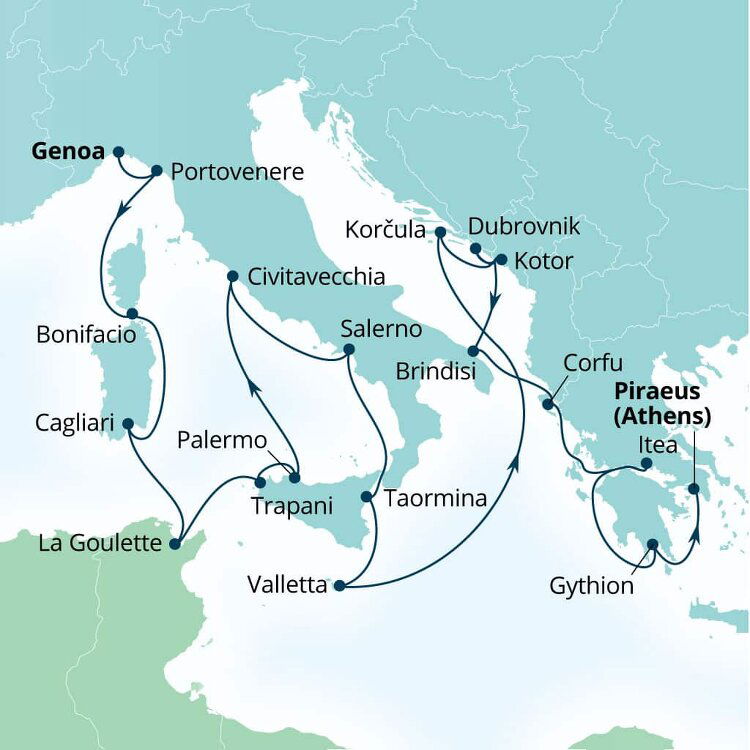 Perched on a low-lying, palazzi-dotted promontory on Sicily's west coast, Trapani reveals a hint of its medieval past in its historic core's maze of narrow streets. Surrounded by glowing turquoise waters and rugged coastline, it is the gateway to western Sicily's ruins. Ships will dock at Porto di Trapani.
