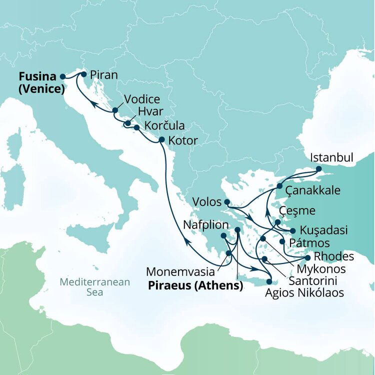Cruise into Cesme, a charming coastal town on the Aegean Sea. The port is conveniently located near the city's centre, and within walking distance, cruisers will find a range of amenities, including shops, cafes, and local markets.