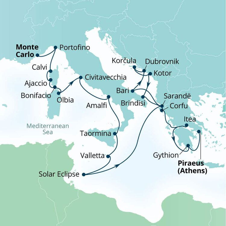 The lush and verdant island of Corfu lies in the Ionian Sea, midway between Greece and Italy. It is an island of sparkling beaches, mountains splashed with wildflowers, and historical, perched fortresses. Ships will dock at the town of Corfu.