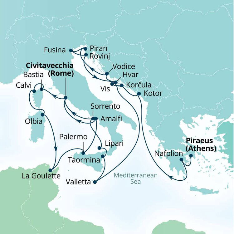 Sorrento's colourful, sun-faded facades cascade down from green hills and cliffs to the Bay of Naples. Looking out from Sorrento, in the Gulf of Naples, is the isle of Capri. Well known for its sparkling Blue Grotto and as the playground of the rich and famous. Ships will anchor offshore and tenders will be provided to the marina.