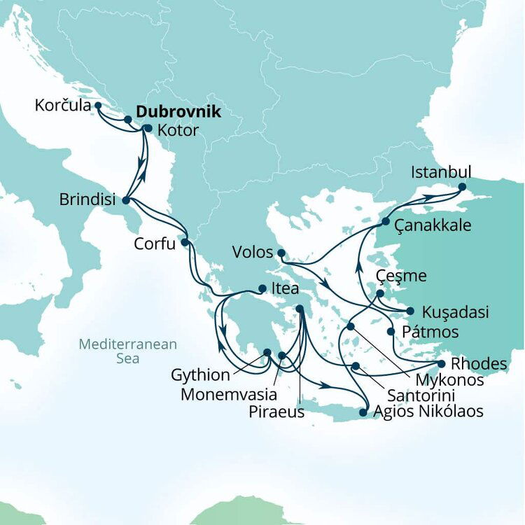 Set on the east of the Greek island Crete, Agios Nikolaos seamlessly blends the charm of a small fishing village with the glamour of a chic resort town. Pastel-coloured houses surround the towns pretty harbour and inky lake, while busy restaurants and cafes spill out onto its lively waterfront. Ships will dock at this port.
