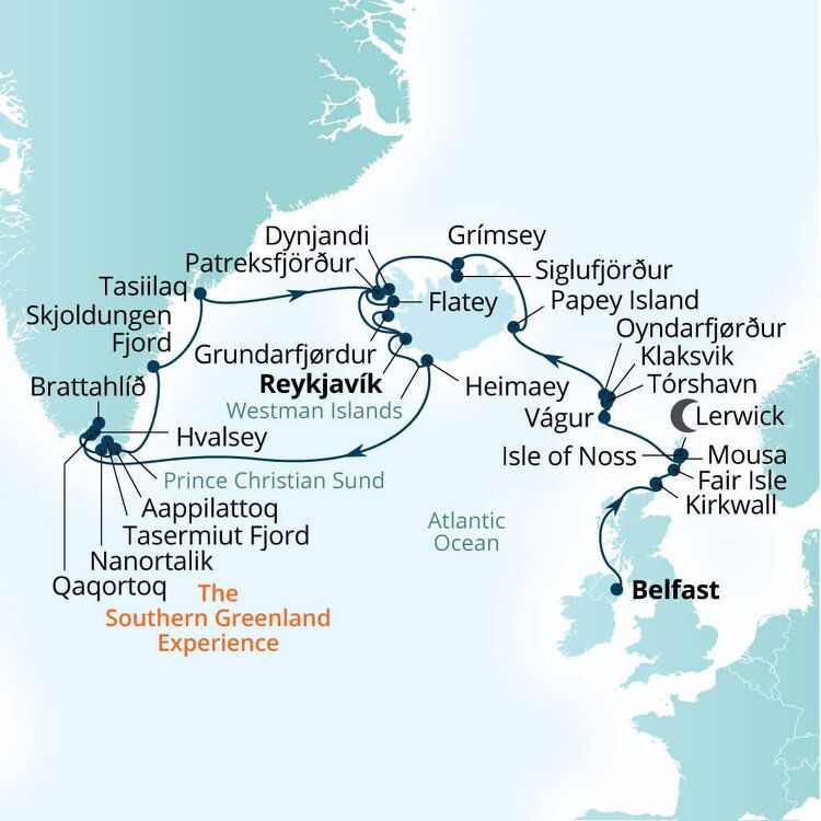 Nanortalik is located on a small island in the southern tip of Greenland. It is an adventurer's wonderland with vertical cliff walls, sheets of floating sea ice and a plethora of Arctic wildlife, including seals and Minke, humpback and fin whales. Sometimes polar bears can also be spotted on the offshore flow of ice. Ships will anchor offshore and tender guests to shore.