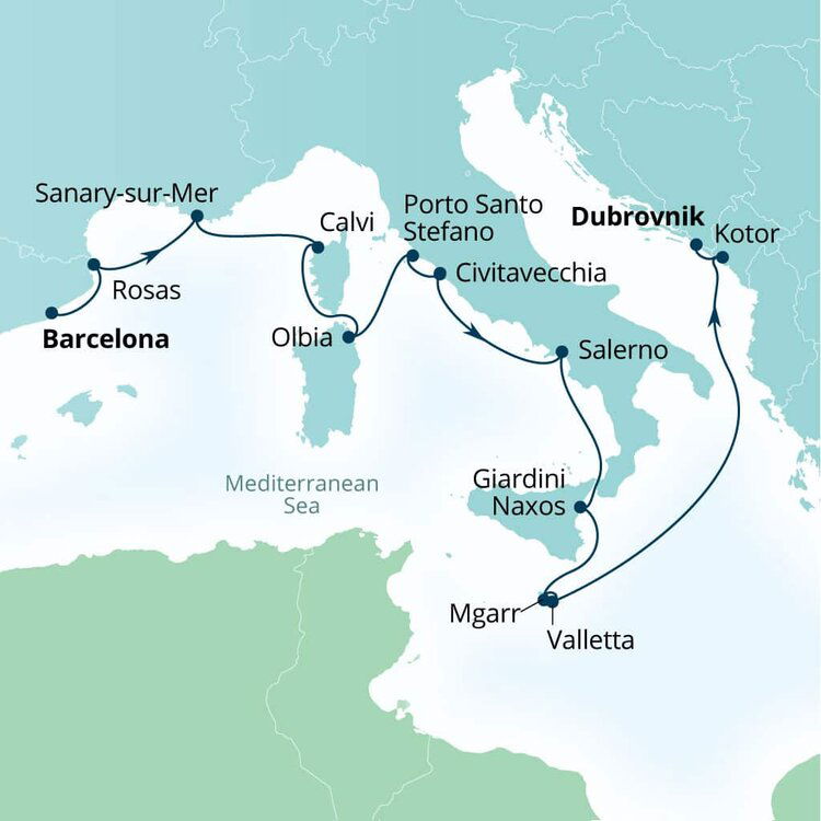Giardini Naxos is a picturesque port town on the east coast of Sicily, nestled at the foot of Taormina and home to stunning beaches and ancient sites. Tender boats usually transport visitors from ships anchored in the bay directly to the heart of town, with the tender drop-off point a stone's throw away from main attractions. Once ashore, visitors can relish the town's beautiful beaches, archaeological sites, and tantalising Sicilian cuisine. Giardini Naxos also serves as an excellent base for excursions to the iconic Mount Etna, approximately 45 km (about 28 miles) away, or the historic town of Taormina, just a 20-minute drive up the coast.