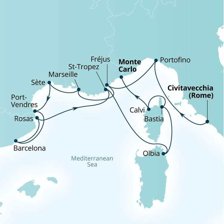 Located on the island of Corsica, Calvi is a beach town with a medieval past. Its cobbled streets climb up to an imposing Genoese Citadel which overlooks a sweeping bay of powdered white sand fringed by maritime pine trees. Ships will anchor offshore and tenders will be proved to Quai Landry.
