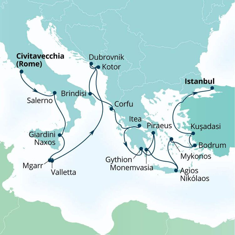 Set on the east of the Greek island Crete, Agios Nikolaos seamlessly blends the charm of a small fishing village with the glamour of a chic resort town. Pastel-coloured houses surround the towns pretty harbour and inky lake, while busy restaurants and cafes spill out onto its lively waterfront. Ships will dock at this port.