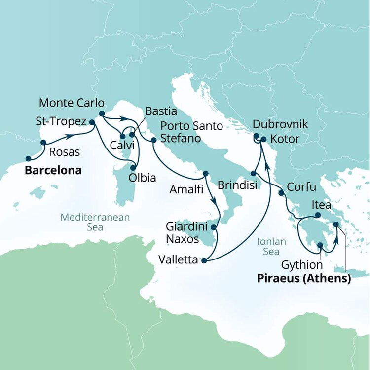 The lush and verdant island of Corfu lies in the Ionian Sea, midway between Greece and Italy. It is an island of sparkling beaches, mountains splashed with wildflowers, and historical, perched fortresses. Ships will dock at the town of Corfu.