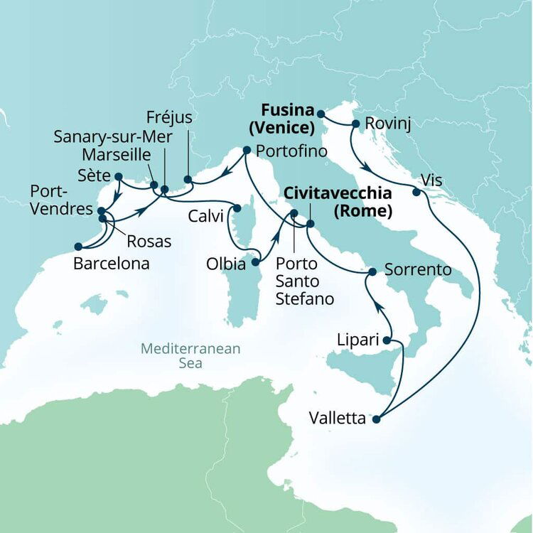 Located on the island of Corsica, Calvi is a beach town with a medieval past. Its cobbled streets climb up to an imposing Genoese Citadel which overlooks a sweeping bay of powdered white sand fringed by maritime pine trees. Ships will anchor offshore and tenders will be proved to Quai Landry.