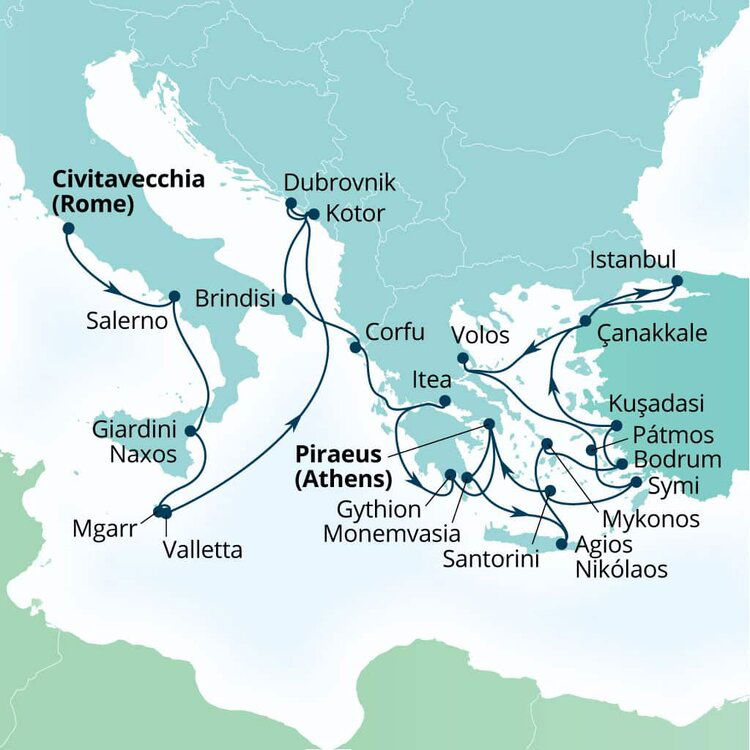 Set on the east of the Greek island Crete, Agios Nikolaos seamlessly blends the charm of a small fishing village with the glamour of a chic resort town. Pastel-coloured houses surround the towns pretty harbour and inky lake, while busy restaurants and cafes spill out onto its lively waterfront. Ships will dock at this port.