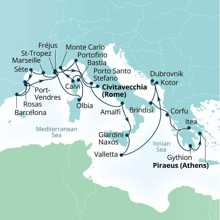 The lush and verdant island of Corfu lies in the Ionian Sea, midway between Greece and Italy. It is an island of sparkling beaches, mountains splashed with wildflowers, and historical, perched fortresses. Ships will dock at the town of Corfu.
