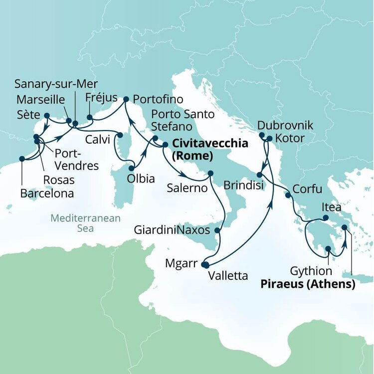 You'll dock at the port of Itea, which is 17 kilometers (11 miles) from Delphi, with a travel time of about 30 minutes. Itea itself is a charming coastal town with its serene waterfront and inviting cafes, offering a pleasant start before heading to the ancient ruins of Delphi.