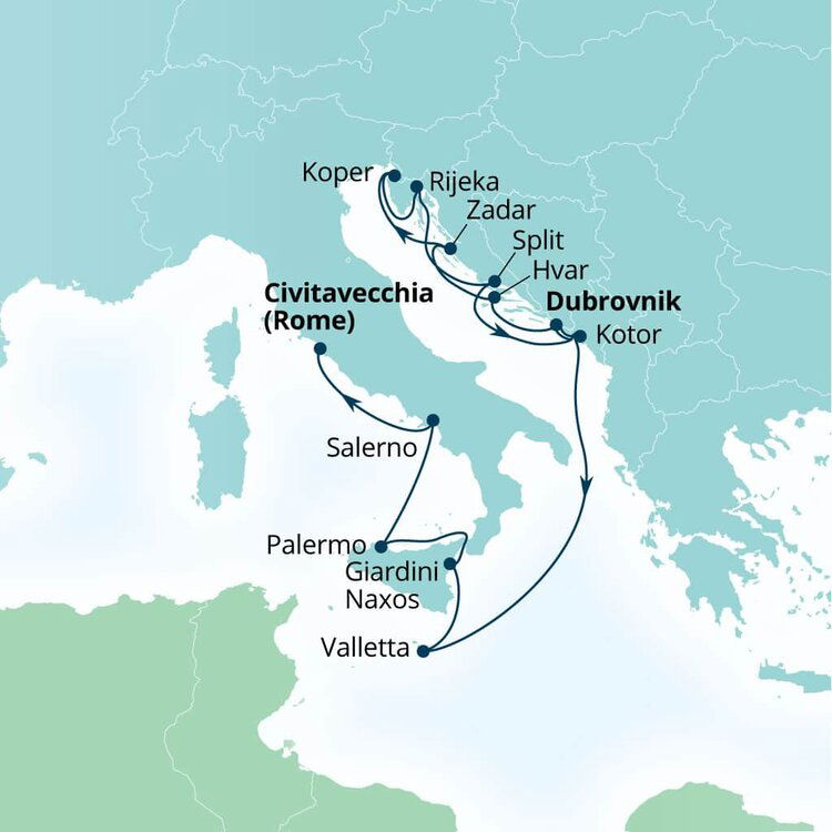 Giardini Naxos is a picturesque port town on the east coast of Sicily, nestled at the foot of Taormina and home to stunning beaches and ancient sites. Tender boats usually transport visitors from ships anchored in the bay directly to the heart of town, with the tender drop-off point a stone's throw away from main attractions. Once ashore, visitors can relish the town's beautiful beaches, archaeological sites, and tantalising Sicilian cuisine. Giardini Naxos also serves as an excellent base for excursions to the iconic Mount Etna, approximately 45 km (about 28 miles) away, or the historic town of Taormina, just a 20-minute drive up the coast.