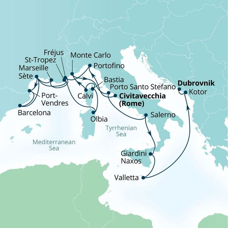 Located on the island of Corsica, Calvi is a beach town with a medieval past. Its cobbled streets climb up to an imposing Genoese Citadel which overlooks a sweeping bay of powdered white sand fringed by maritime pine trees. Ships will anchor offshore and tenders will be proved to Quai Landry.