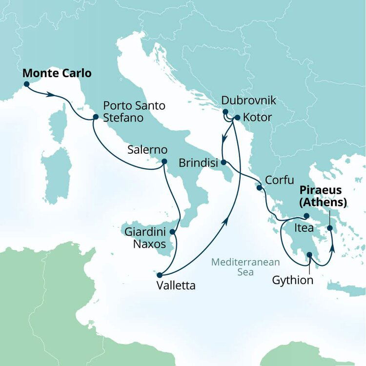 The lush and verdant island of Corfu lies in the Ionian Sea, midway between Greece and Italy. It is an island of sparkling beaches, mountains splashed with wildflowers, and historical, perched fortresses. Ships will dock at the town of Corfu.