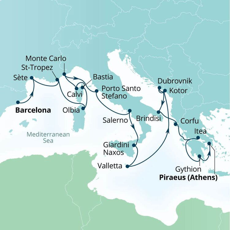 Giardini Naxos is a picturesque port town on the east coast of Sicily, nestled at the foot of Taormina and home to stunning beaches and ancient sites. Tender boats usually transport visitors from ships anchored in the bay directly to the heart of town, with the tender drop-off point a stone's throw away from main attractions. Once ashore, visitors can relish the town's beautiful beaches, archaeological sites, and tantalising Sicilian cuisine. Giardini Naxos also serves as an excellent base for excursions to the iconic Mount Etna, approximately 45 km (about 28 miles) away, or the historic town of Taormina, just a 20-minute drive up the coast.