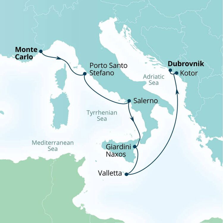 Giardini Naxos is a picturesque port town on the east coast of Sicily, nestled at the foot of Taormina and home to stunning beaches and ancient sites. Tender boats usually transport visitors from ships anchored in the bay directly to the heart of town, with the tender drop-off point a stone's throw away from main attractions. Once ashore, visitors can relish the town's beautiful beaches, archaeological sites, and tantalising Sicilian cuisine. Giardini Naxos also serves as an excellent base for excursions to the iconic Mount Etna, approximately 45 km (about 28 miles) away, or the historic town of Taormina, just a 20-minute drive up the coast.
