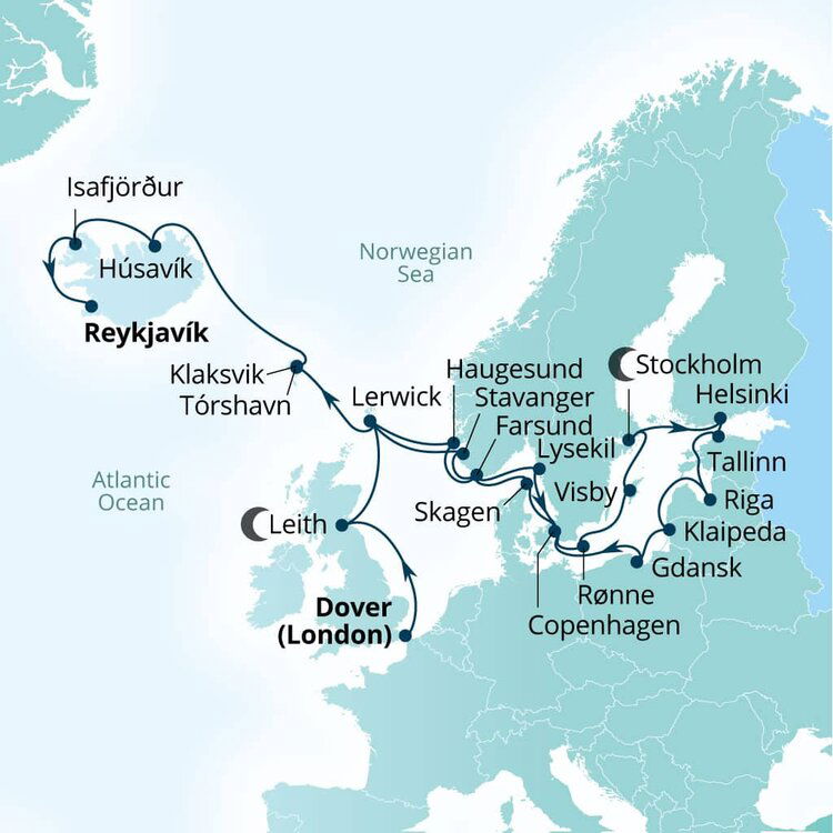 Tucked away on the northern coast of Iceland along the picturesque shores of Skjálfandi Bay is Husavik, a small fishing community that has garnered a well-deserved reputation as one of the best whale-watching destinations in the world. Ships will anchor offshore and tenders will be provided to the shore.