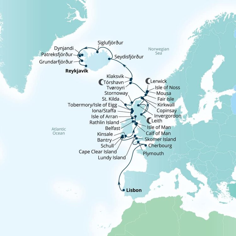 Sitting in the finger-like scenery of the Westfjords, Patreksfjordur is built on time-tested fishing traditions. This small Icelandic village is surrounded by flat-topped mountains, cutting inlets, evocative beaches and dramatic cliffs with crowds of birdlife clinging to them. Ships will dock or anchor offshore at this port.