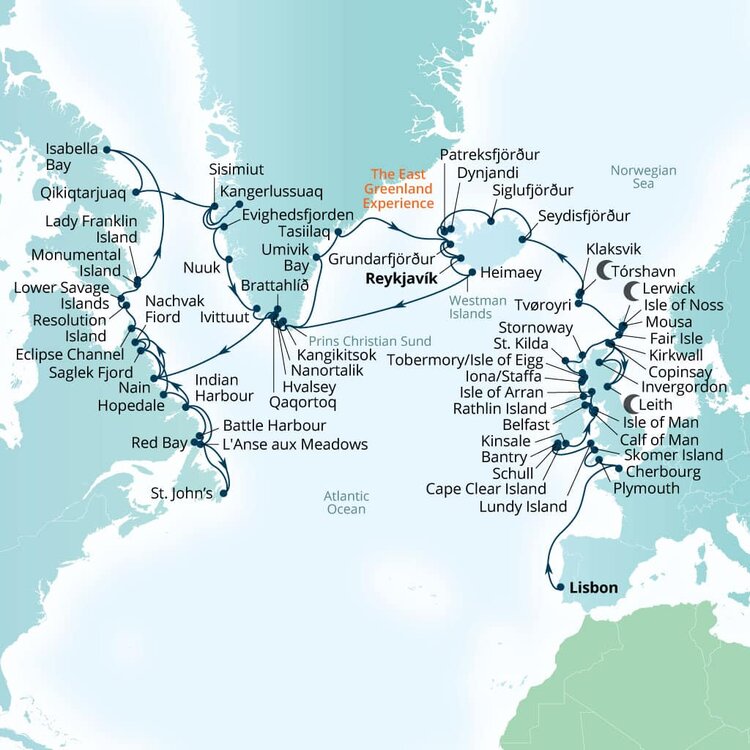 Nanortalik is located on a small island in the southern tip of Greenland. It is an adventurer's wonderland with vertical cliff walls, sheets of floating sea ice and a plethora of Arctic wildlife, including seals and Minke, humpback and fin whales. Sometimes polar bears can also be spotted on the offshore flow of ice. Ships will anchor offshore and tender guests to shore.