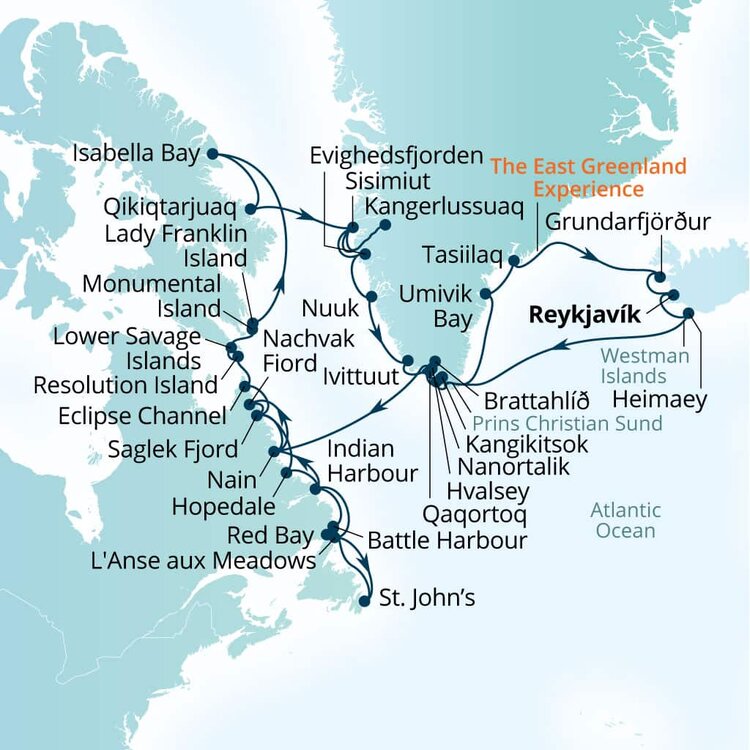 On the King Frederick VI Coast of Greenland’s southeast quadrant, the semi-circular Umivik Bay is carved out just north of the Denmark Strait. Unlike the sheer cliffs and rugged terrain presented by much of the coastline, the shores inside the bay are smooth and the massive Greenland Ice Sheet comes right down to the shore in undulating slopes. This profile persuaded Fritjof Nansen to select the bay as the starting point of his successful 1888 expedition to cross Greenland over the ice sheet. There are several large islands in the bay, including Uppernattivik Island smack in the middle. There are calving glaciers to survey and a landing is possible here as well.