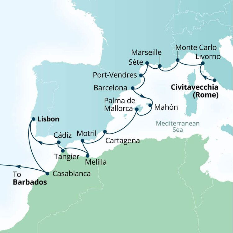 The Port of Cádiz is located directly adjacent to the city center, so you'll be able to explore the historic heart of Cádiz with a short 10-minute walk. The city is renowned for its ancient maritime heritage, beautiful beaches, and well-preserved landmarks such as the Cádiz Cathedral and the Torre Tavira, offering panoramic views of the city. If your plan is to visit Seville, it's about 120 kilometers (75 miles) away - roughly a 90-minute drive. Consider arranging a guided excursion to make the most of your time in this historic city.