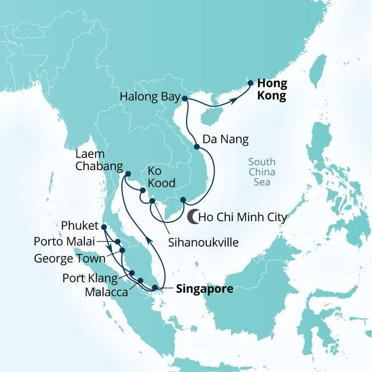 Malaysia’s dynamic capital is a melting pot of skyscrapers, Islamic architecture and British Colonial buildings offering a futuristic cityscape with an enduring nod to yesteryear. Home to some of Asia’s most opulent shopping malls, Kuala Lumpur’s skyline is dominated by the famous Petronas and Menara Kuala Lumpur Towers. Ships will dock in Port Klang.