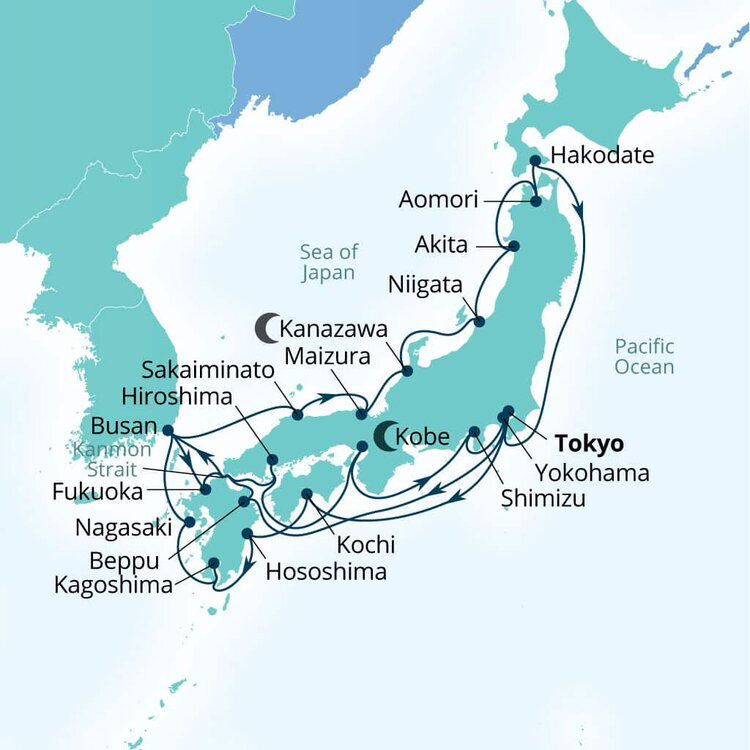 Overlooking Beppu Bay to its east and dramatic mountain peaks to the west, Beppu is blanketed with misty turquoise waters and elegant Japanese foliage. Its main attraction is the 'Hells of Beppu,' a collection of 8 onsen, or hot springs, some of which feature geysers and colourful waters ranging from white to copper to sapphire. Ships will dock at the port of Beppu.