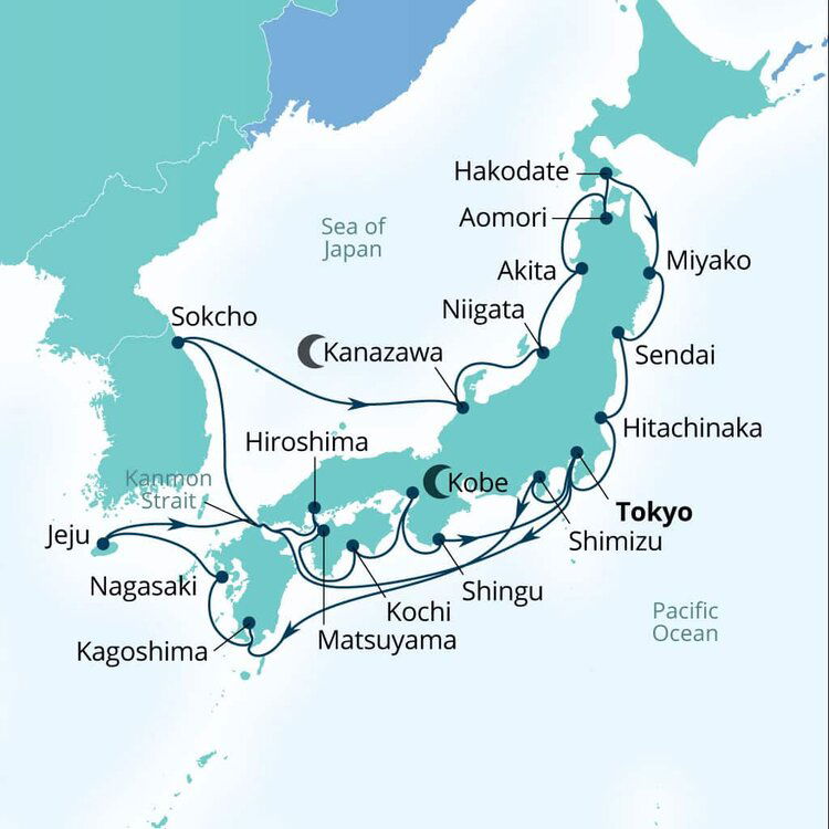 Honshu's northernmost city is full of picturesque historic temples, museums, and close to incredible nature like Mt. Hakkoda. In the spring and summer, Aomori bursts to life with cherry blossom festivals and the fiery Nebuta Festival every August. Ships dock at the Shin-Chuo wharf.