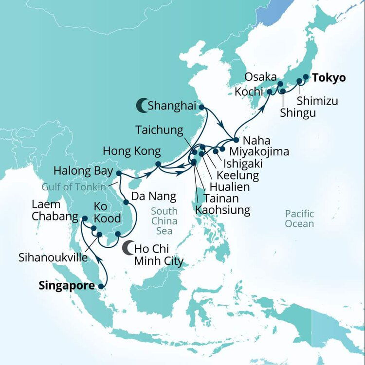 In Keelung, cruise ships dock at the Keelung Port, which serves as the gateway to Taipei, located approximately 25 kilometers (15.5 miles) away. Travel time to Taipei can vary, but it generally takes about 30 to 45 minutes by car, depending on traffic.