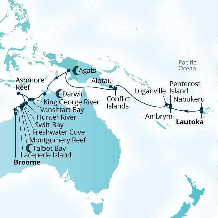 The Conflict Islands are a group of 21 islands encircling an enormous lagoon on the rim of a sunken volcano. Sheltered by an untouched reef system, the privately owned islands are abundant with marine life and part of a conservation project. Ships will anchor off shore and tenders will be provided to the jetty.