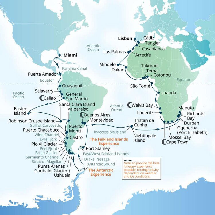 Located at the southernmost end of South America, Ushuaia is is often called a doorway to Antarctica. The town boasts incredible natural beauty through its national parks like the Tierra del Fuego National Park with cultural institutions like the Museo del Fin del Mundo, or the End of the World Museum. Ships will dock at this port.
