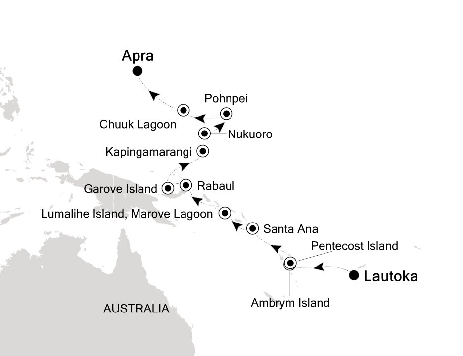 Rabaul, the former provincial capital, has quite a remarkable location. The town is inside the flooded caldera of a giant volcano and several sub-vents are still quite active today. Having been occupied by Japan in WWII and destroyed by volcano eruptions twice, the town has a colourful history. Ships will dock at the port.