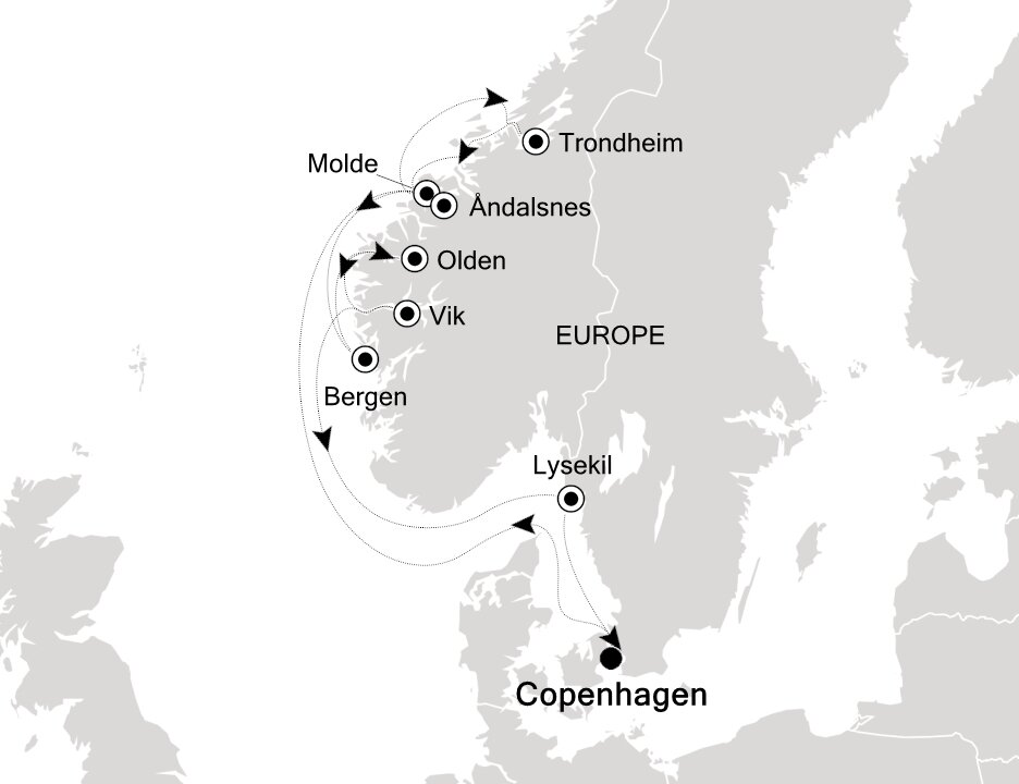 Known as the Town of Roses, Molde offers all of the stunning beauty associated with Norway. White clapboard houses sit alongside a sparkling fjord overlooking the city's famous panoramic view of 222 mountain peaks. Ships will dock at the Port of Molde & Romsdal.