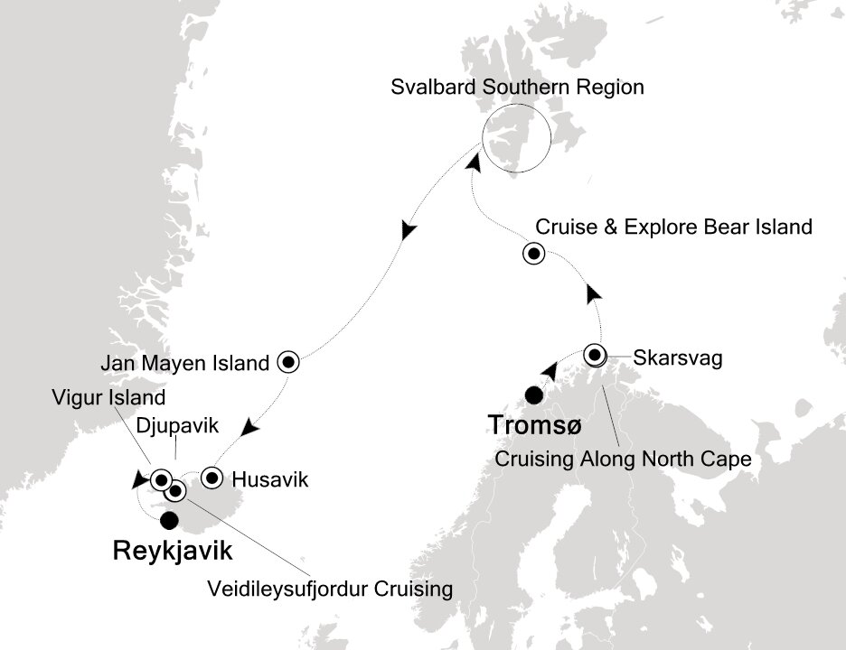 With permission from the Norwegian authorities, a landing is possible at this rarely visited outpost. Visitors may walk to the research and weather station, or beyond, for birds-eye views of the meteorological station and the long black sandy eastern shore of the island.