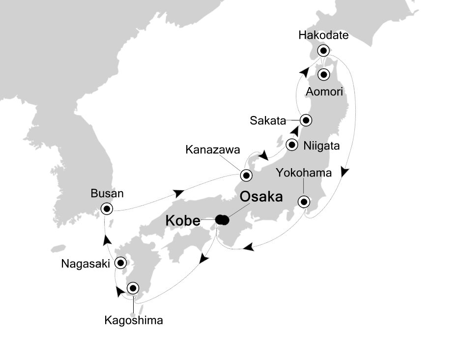 Osaka's Tempozan Cruise Terminal is located about 15 km (9 miles) from Osaka city center, a 30-minute drive. Kyoto is roughly 60 km (37 miles) away.
