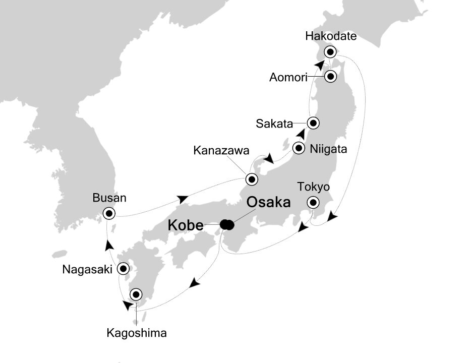 Osaka's Tempozan Cruise Terminal is located about 15 km (9 miles) from Osaka city center, a 30-minute drive. Kyoto is roughly 60 km (37 miles) away.