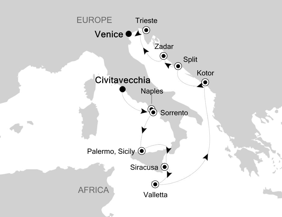 Your ship will dock at the Trieste Cruise Terminal, located right in the heart of the city. This makes it easy to explore Trieste’s rich history and charming architecture. Key attractions like Piazza Unità d'Italia, the Roman Theatre, and Miramare Castle are easily accessible by foot or a short bus ride. For a scenic adventure, consider a tram ride up to the hilltop village of Opicina, offering stunning views of the city and Adriatic Sea.