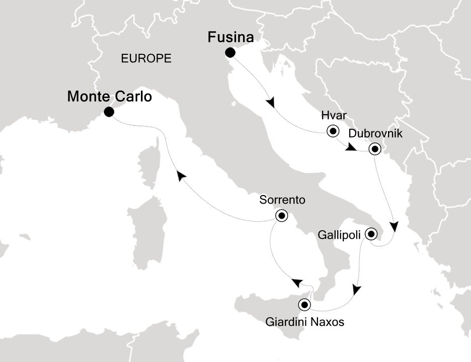 Giardini Naxos is a picturesque port town on the east coast of Sicily, nestled at the foot of Taormina and home to stunning beaches and ancient sites. Tender boats usually transport visitors from ships anchored in the bay directly to the heart of town, with the tender drop-off point a stone's throw away from main attractions. Once ashore, visitors can relish the town's beautiful beaches, archaeological sites, and tantalising Sicilian cuisine. Giardini Naxos also serves as an excellent base for excursions to the iconic Mount Etna, approximately 45 km (about 28 miles) away, or the historic town of Taormina, just a 20-minute drive up the coast.