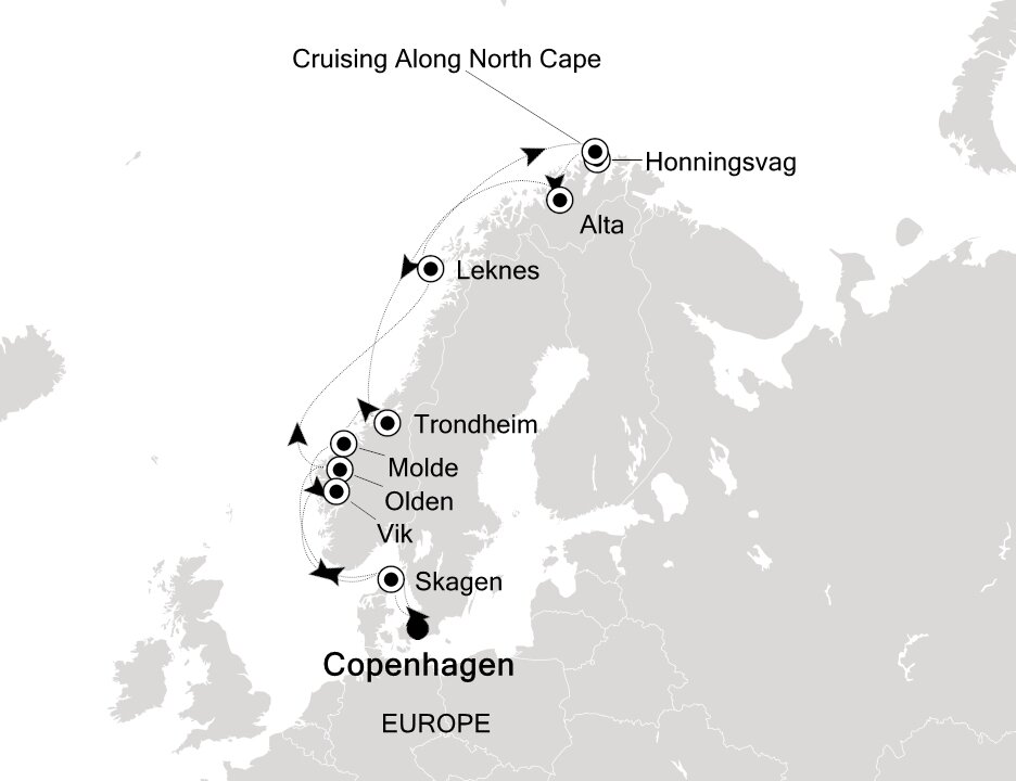 The world’s northernmost village, Honningsvag is the gateway to the North Cape. It is a completely modern fishing harbour set in a land of forests, fjord waters, and crashing waterfalls. The cliffs of the North Cape are perched 1,000 feet above the Arctic Ocean and provides a lookout over a limitless panorama.