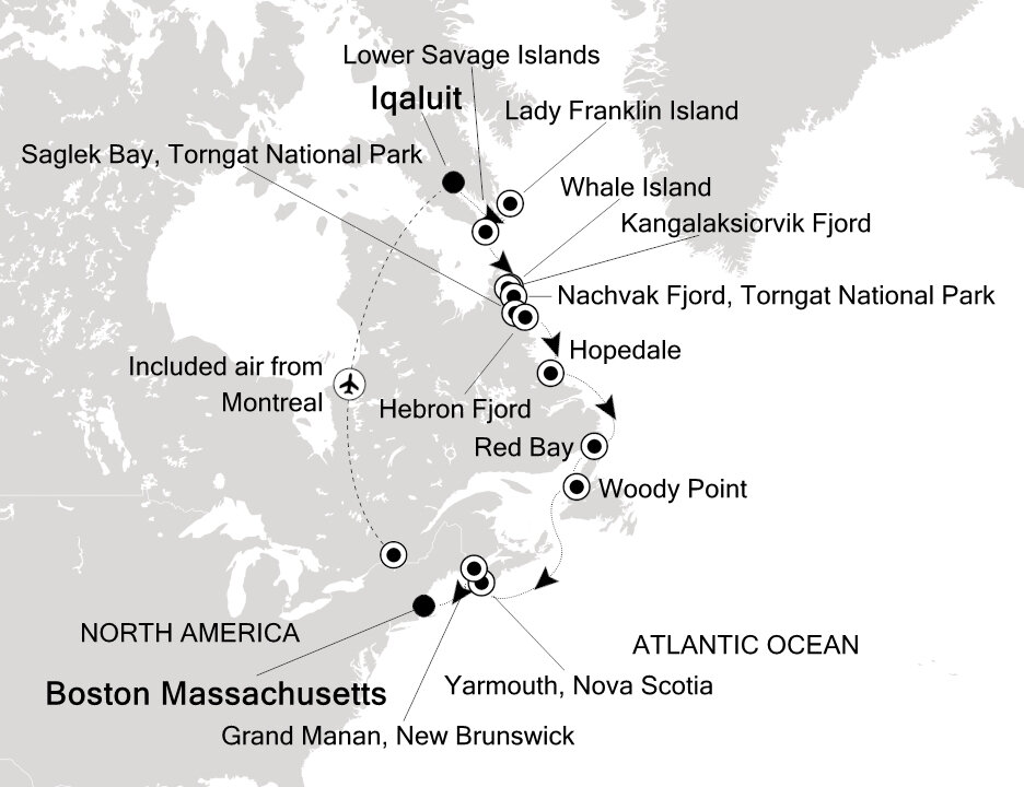 Monumental cliffs and perfectly sculpted U-shaped valleys - there’s no doubting the power of the elemental forces that have shaped Saglek Bay. This scenic inlet invites you to explore dramatic mountain vistas and search for the elusive northerly wildlife of Labrador and Newfoundland. Saglek Bay is a gateway to the Torngat Mountains National Park, a vast and remote wilderness of soaring fjords, rugged peaks and profound Inuit heritage. Dotted across the bay’s waters are a series of islands including Branagin Island, Jens Haven Island, and Handy Island, where seabirds call out across the sparse tundra.