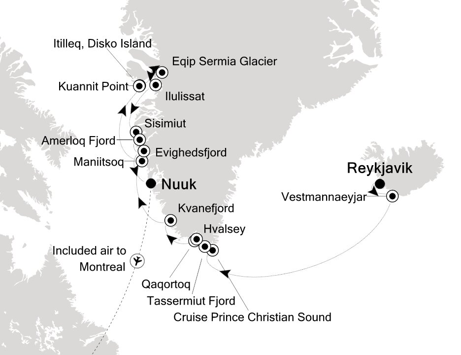 The largest town in southern Greenland, colourful Qaqortoq rises steeply over the fjord system around the city, offering breath-taking panoramic vistas of the surrounding mountains, deep, blue sea, Lake Tasersuag, icebergs in the bay, and pastoral backcountry. Ships will anchor offshore and tender guests to shore.