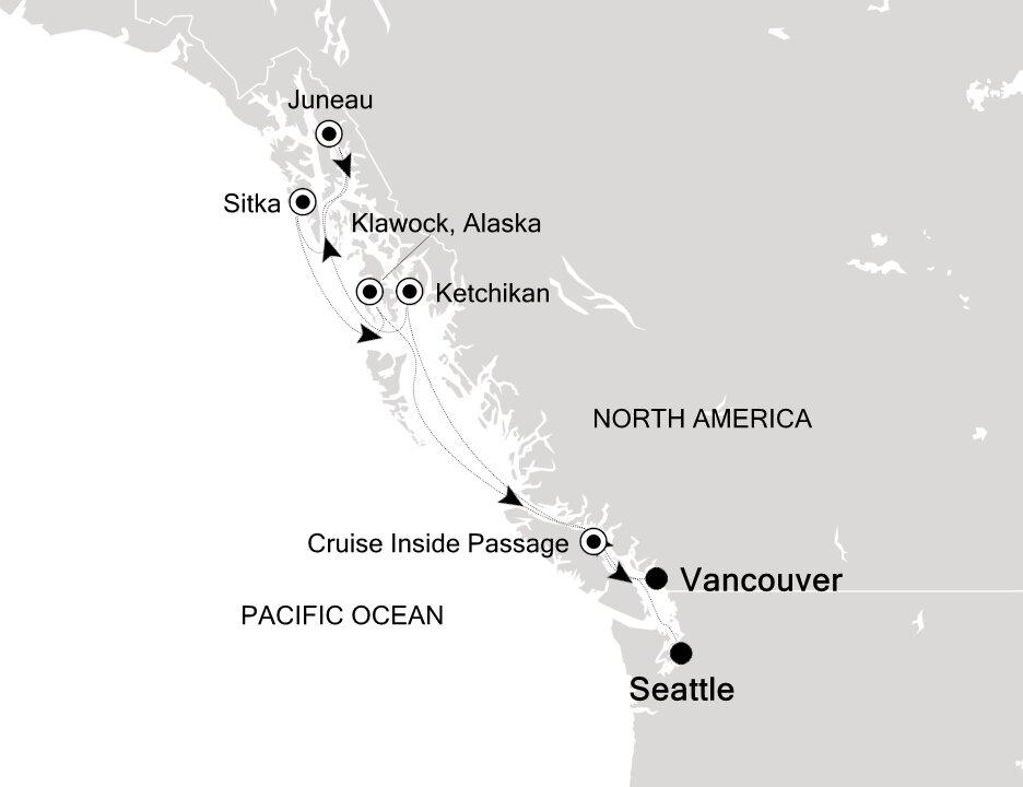 Alaska's Inside Passage offers breathtaking views of glaciers, fjords, and abundant wildlife , making it one of the most scenic cruises in the world and one of the few locations where deep-draft ships can sail close to steep mountain walls. Stretching from Puget Sound in Washington to the Alaskan Panhandle, this coastal route provides stunning natural scenery. Expect to see orcas, humpback whales, and sea lions from the deck, while eagles soar overhead.