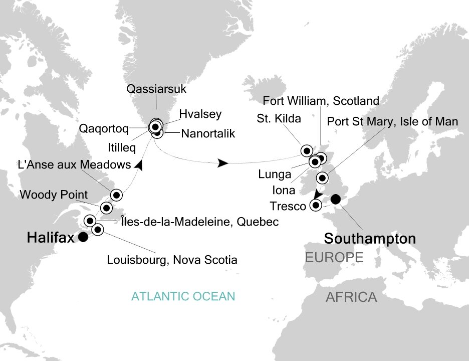 Nanortalik is located on a small island in the southern tip of Greenland. It is an adventurer's wonderland with vertical cliff walls, sheets of floating sea ice and a plethora of Arctic wildlife, including seals and Minke, humpback and fin whales. Sometimes polar bears can also be spotted on the offshore flow of ice. Ships will anchor offshore and tender guests to shore.