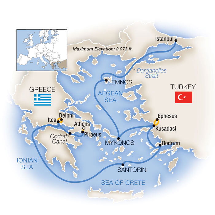 2,500 years in the making, the Corinth Canal links the Ionian Sea with the Aegean. When it was completed in 1893, it effectively turned the Peloponnese peninsula into an island and created an international maritime hub that transformed navigation in southern Europe. Accessible only by small ship, your morning transit through this narrow canal cuts off hundreds of miles of your journey around the Peloponnese, bringing you to the port town of Itea in central Greece this afternoon.